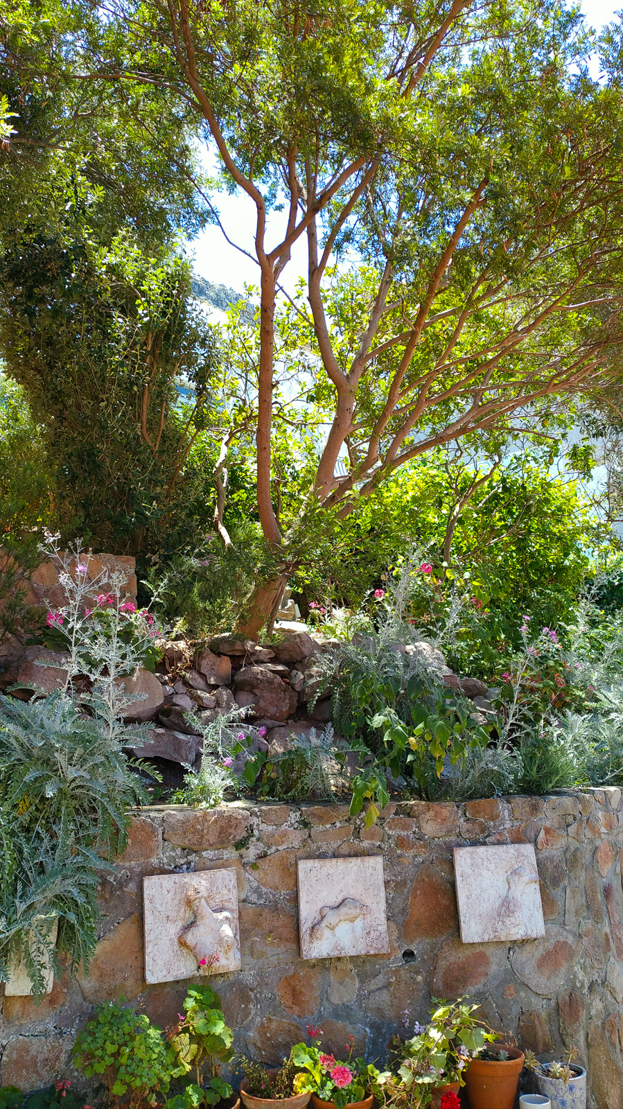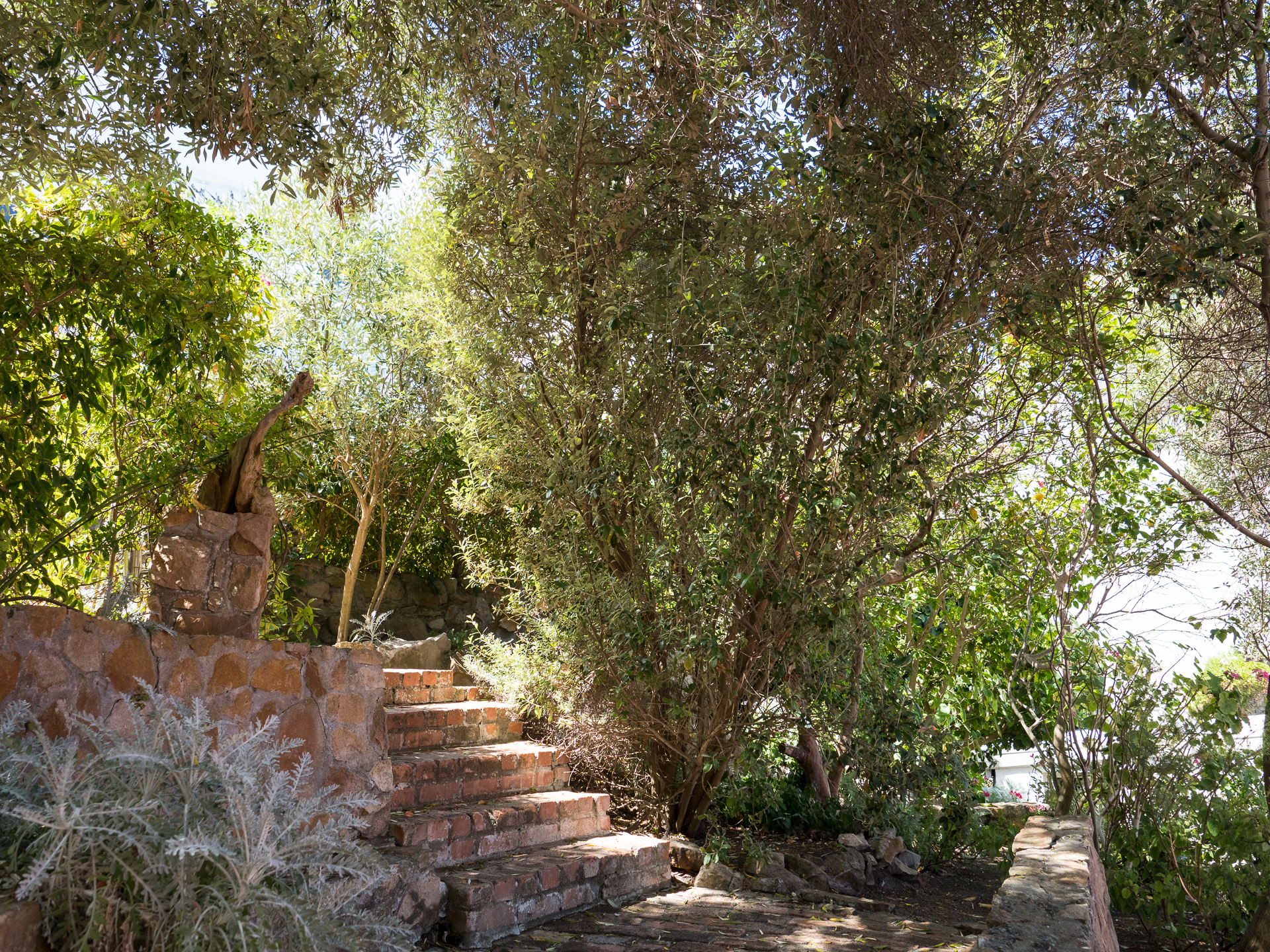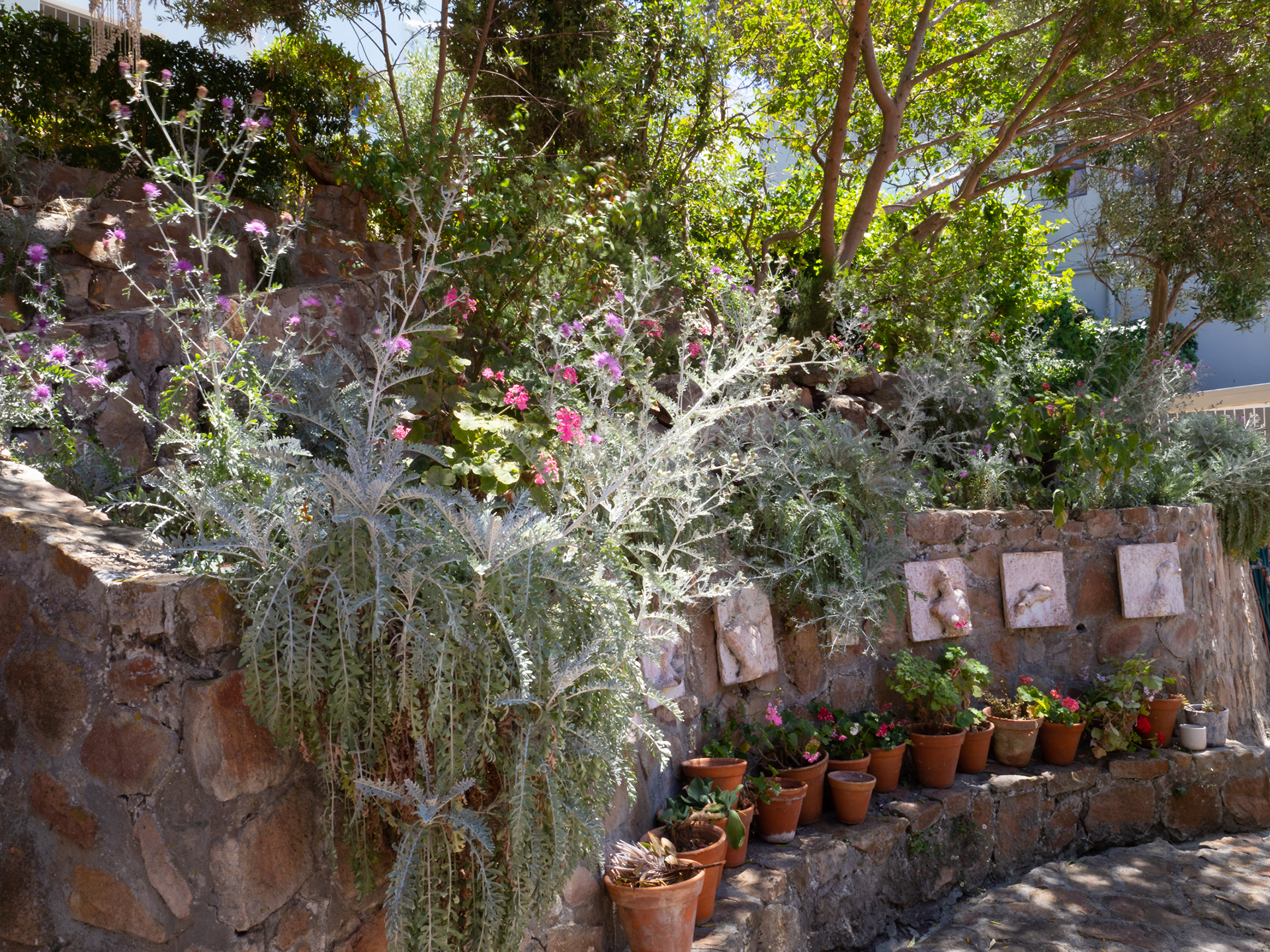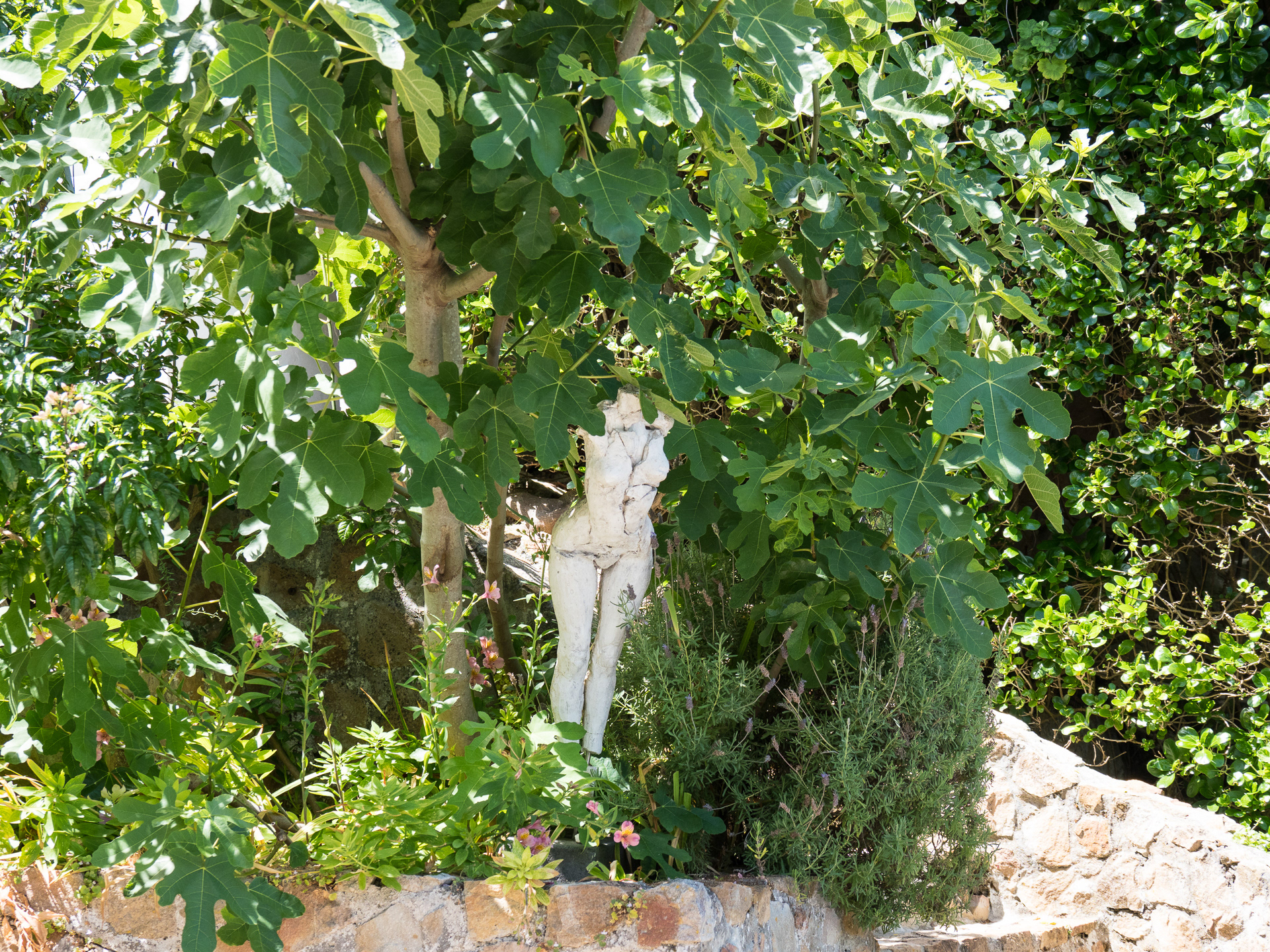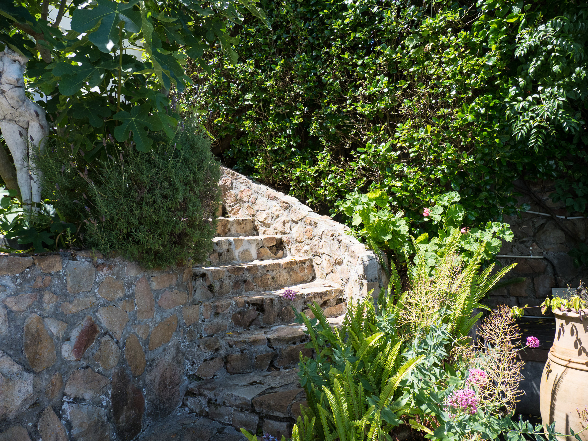 Perfectly well-manicured terraced garden with fig, lemon and olive trees. Wonderful flowers, interesting sculptures and hidden corners
