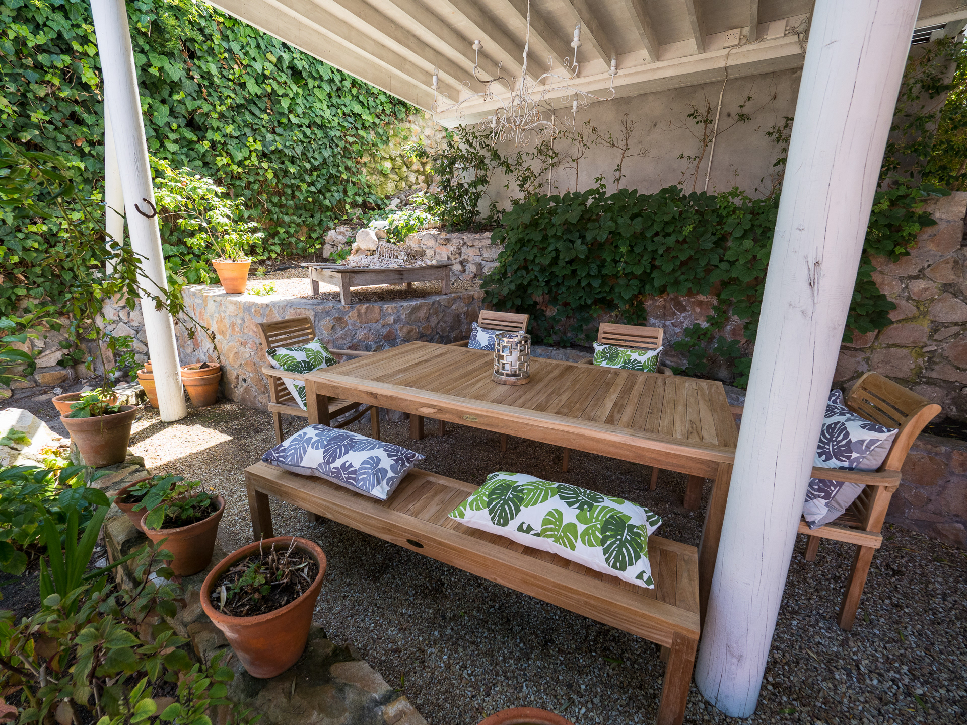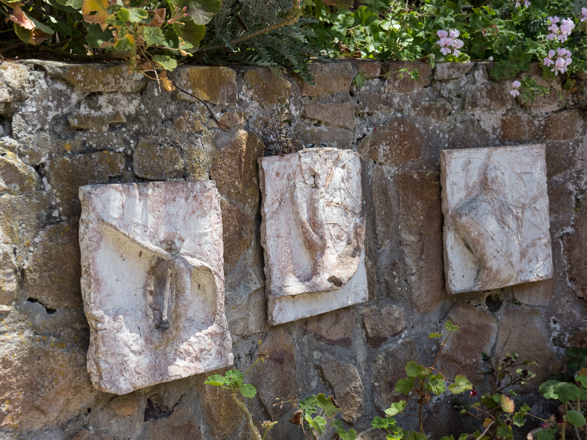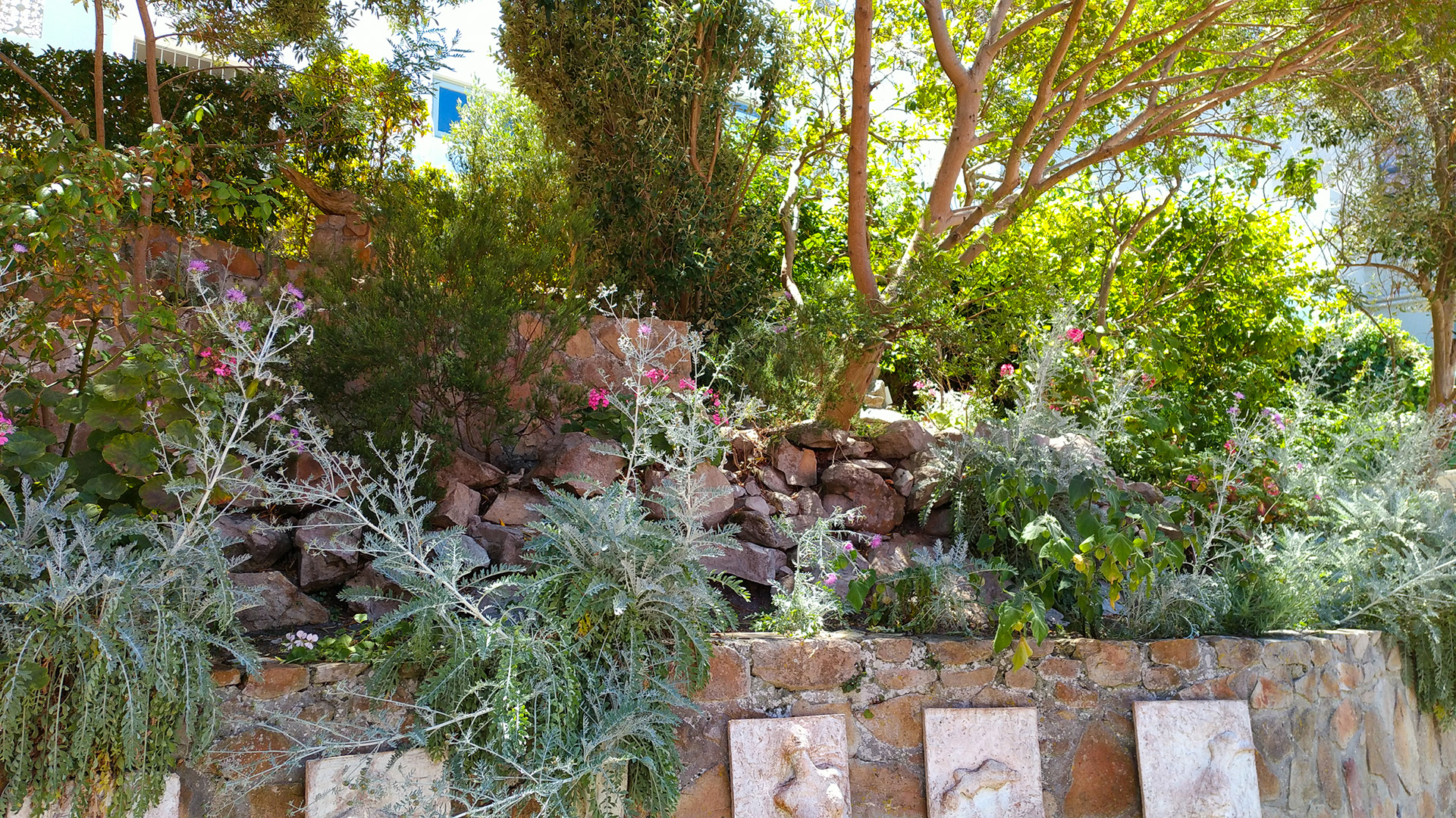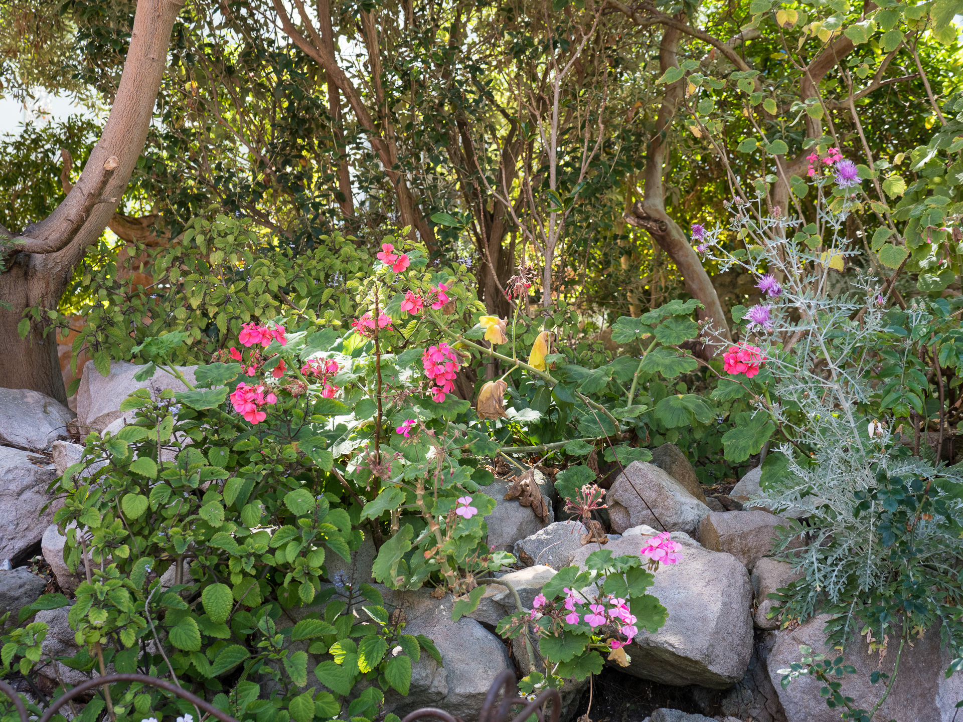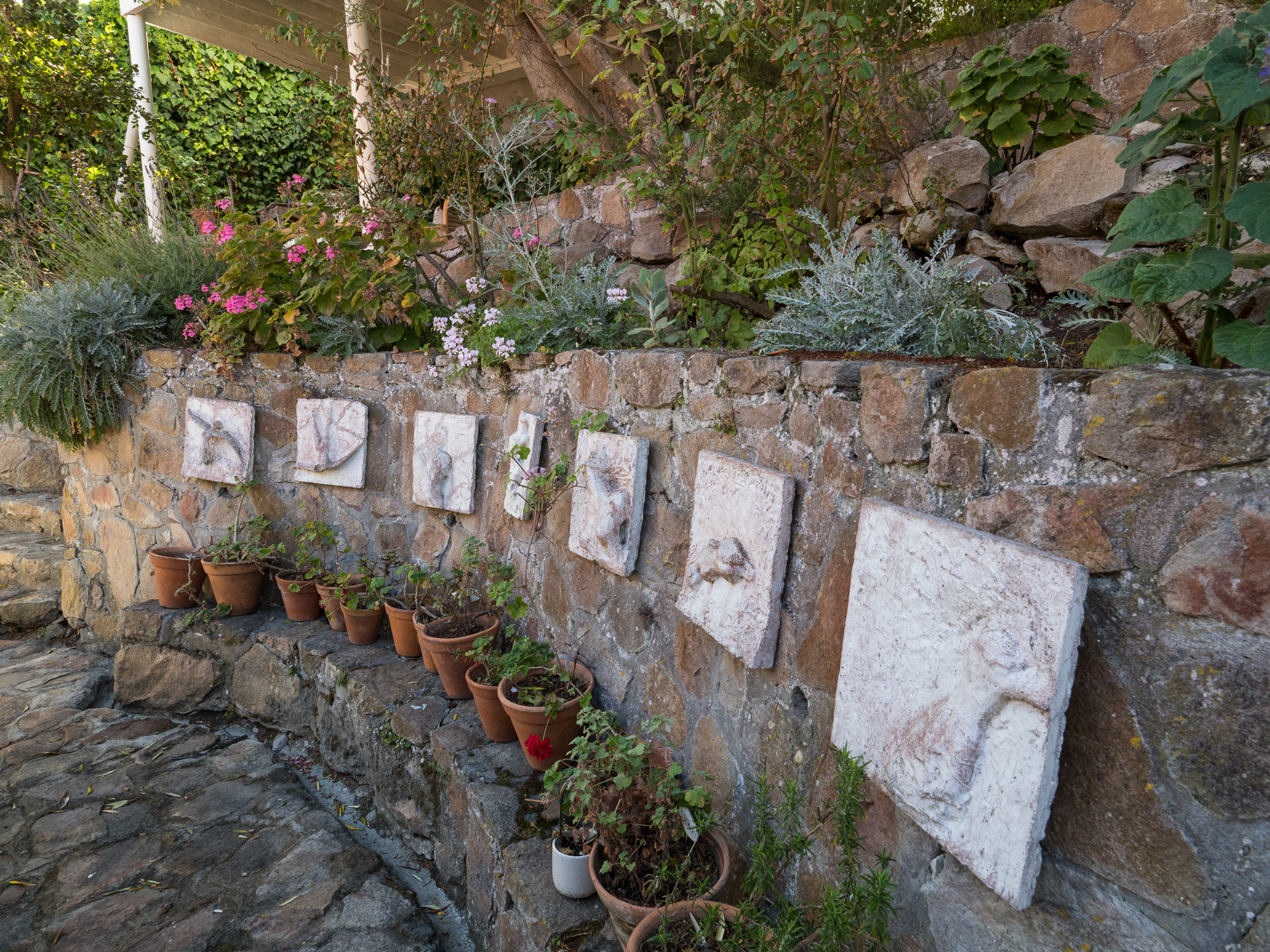 Perfectly well-manicured terraced garden with fig, lemon and olive trees. Wonderful flowers, interesting sculptures and hidden corners